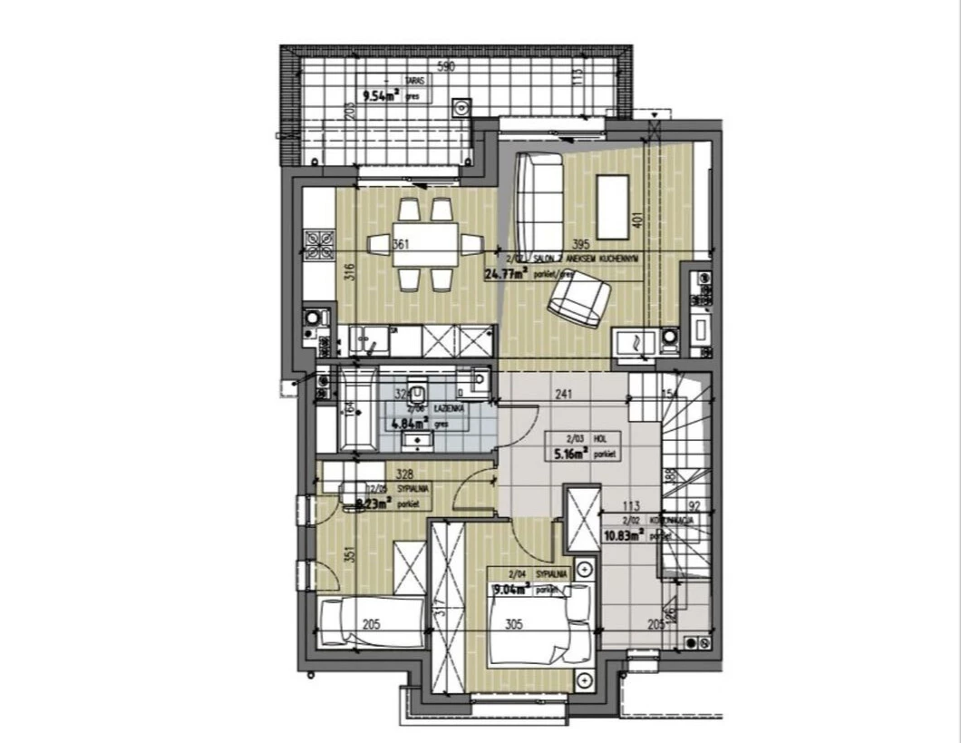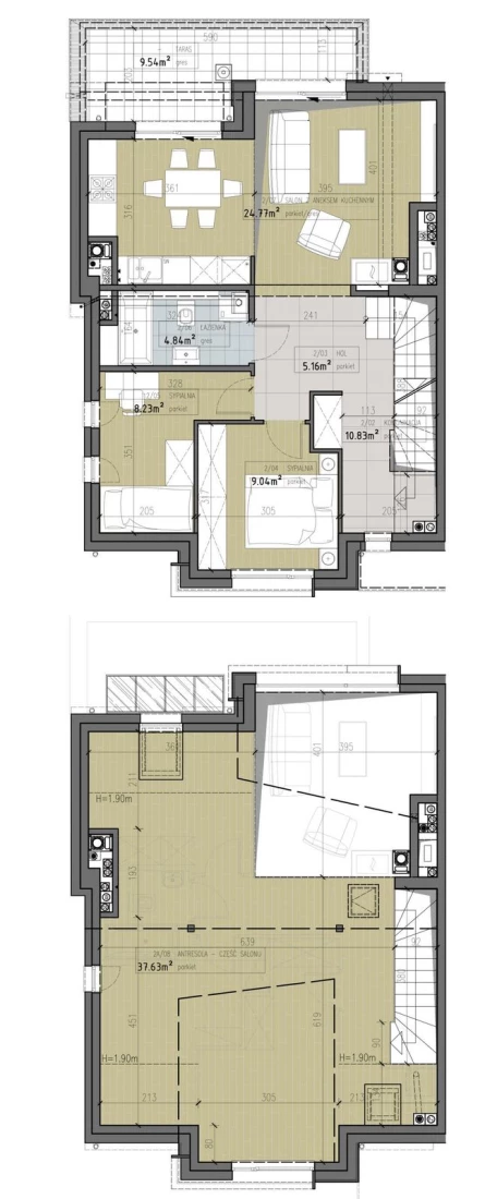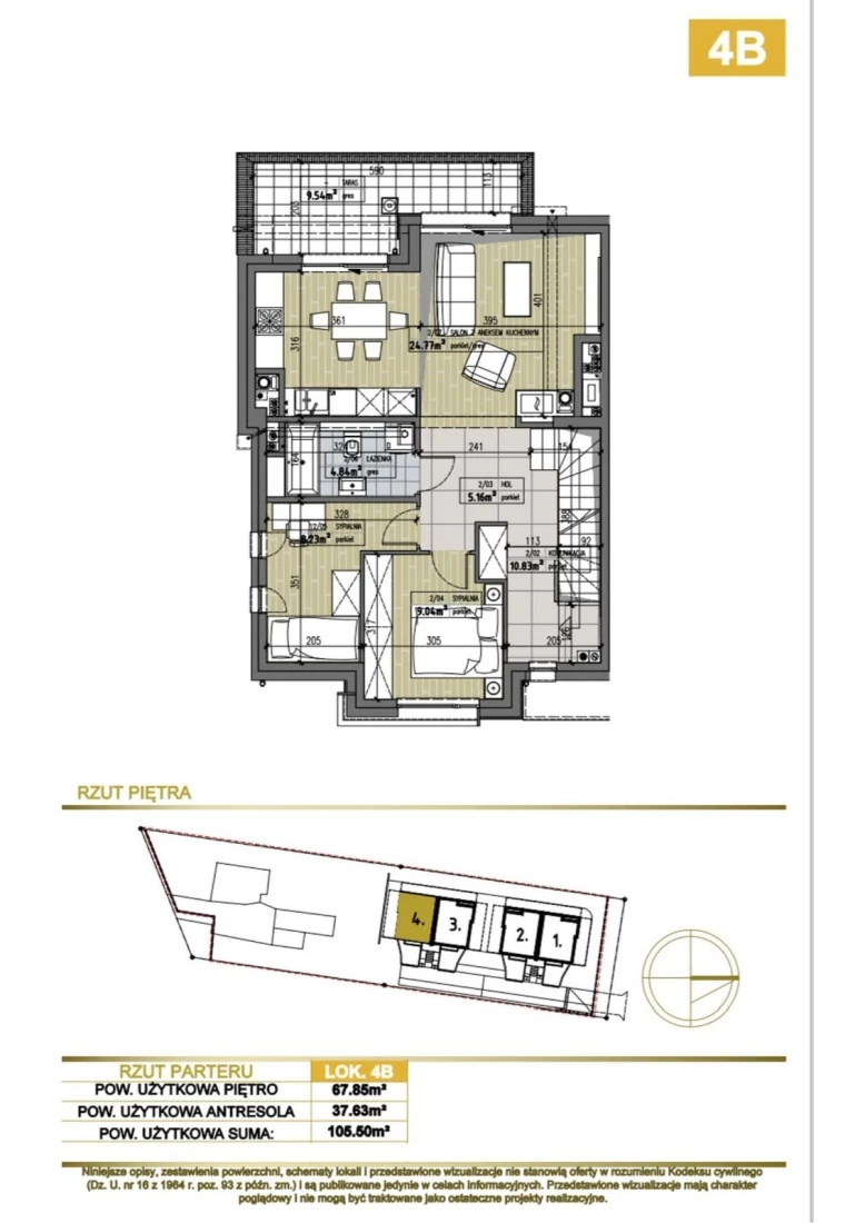 Na powierzchni 105,50m2 tego dwupoziomowego mieszkania znajdują się: